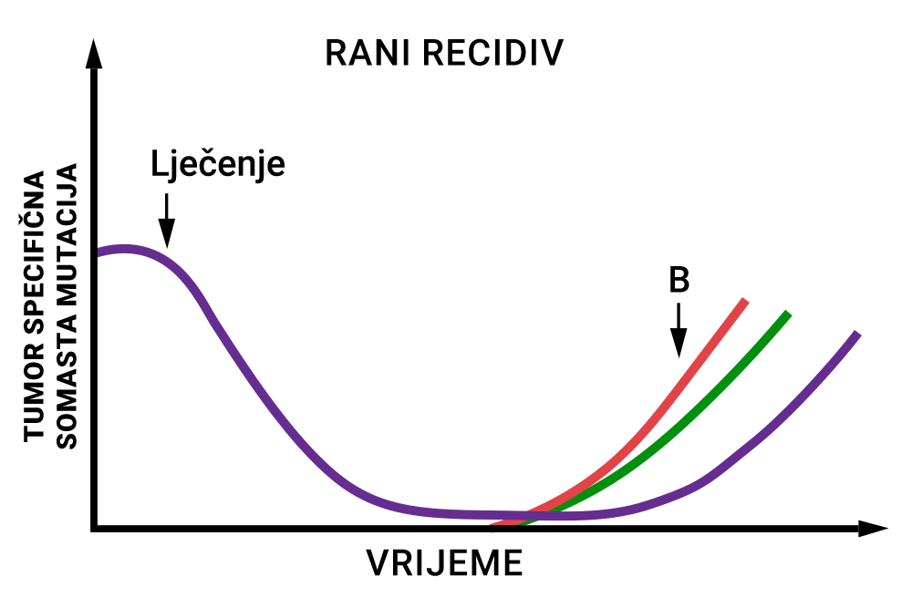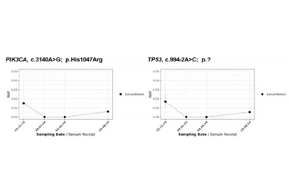 Nakon operacije/liječenja, pacijent se smatrao da je bez tumora. Redovita testiranja tekuće biopsije otkrila su progresiju tumora, pokazujući da povećanje varijante specifične za tumor prati recidiv tumora. Vrlo osjetljiva detekcija ovog biomarkera može otkriti recidiv tumora ranije nego konvencionalne tehnike snimanja. CancerDetect stoga može pomoći liječnicima u praćenju minimalne rezidualne bolesti i otkrivanju recidiva u ranoj fazi. Preporučuje se redovito testiranje.