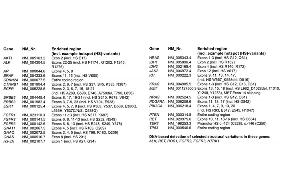 Vrlo osjetljiva i točna detekcija najvažnijih i najčešćih mutacija u 31 genu i fuzija gena u 6 gena s vrlo niskim frekvencijama alela korištenjem duplex UMI tehnologije (NAF ≥ 0,25%). Stoga detektira čak i najmanje količine ctDNK koje su relevantne za širok raspon tumorskih entiteta.